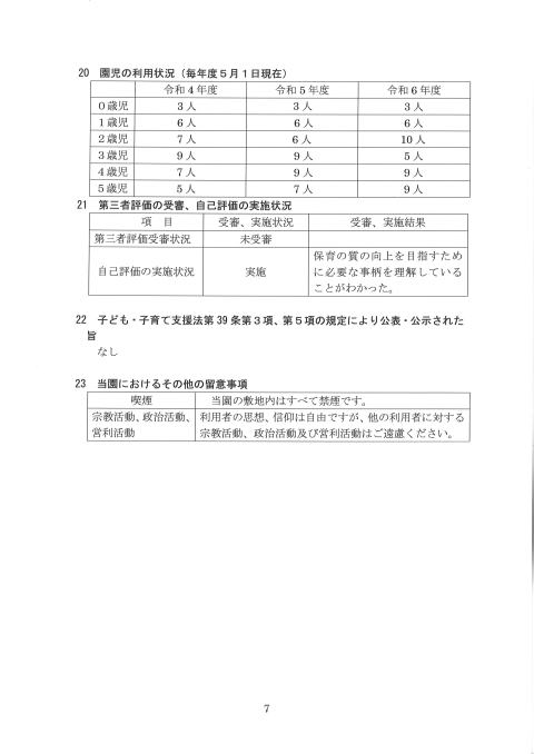・自然の草木に包まれた園 ・子どもの可能性を引き出し、それを発揮できる園 ・異年齢クラスを上手く活用し、共に生活する場を 大切にしてよい友達関係をつくれる園 ・ひとりひとりが安心して楽しい雰囲気の中で 生活できる園 ・家庭と園との連携を大切にし、 お互いに一致した考え方で理解しあって、 共に育てていける園